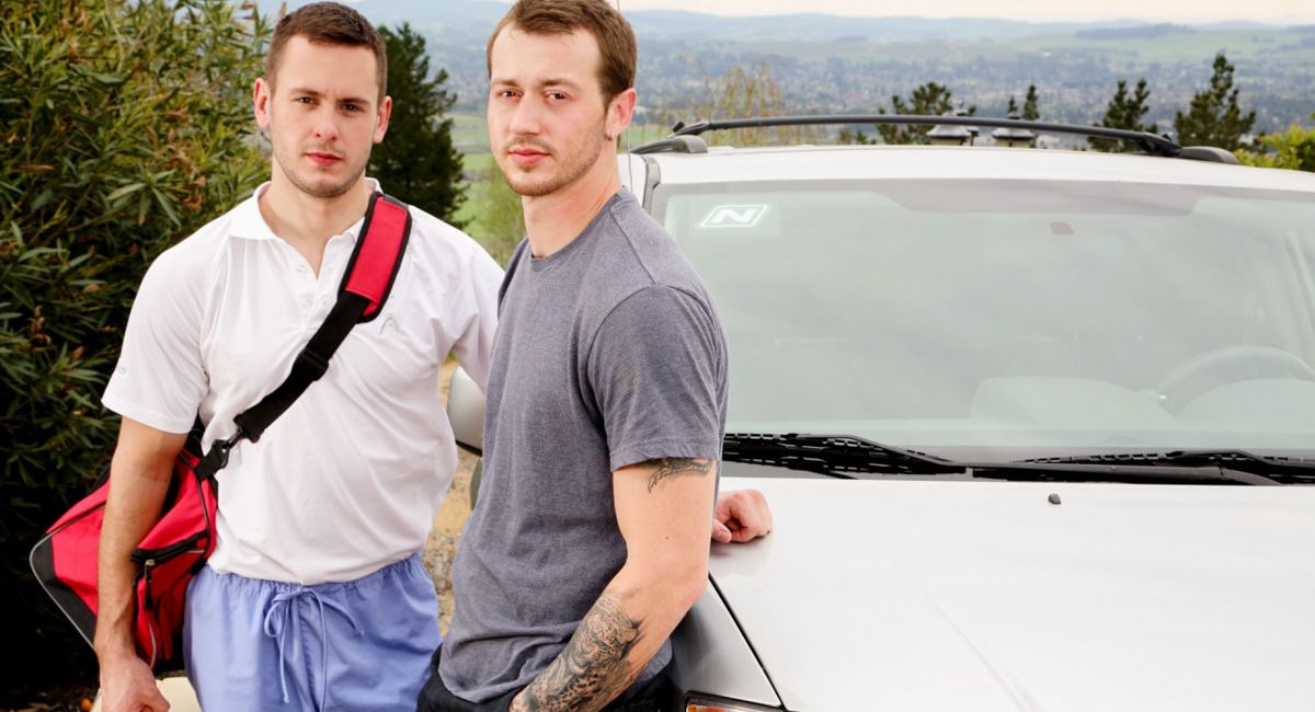 Brenner is between a rock and Mark's hard place, and Mark knows it, so rather than strand Brenner out in the middle of nowhere, he devises a plan to trade services, promising to get Brenner where-ever he needs to go in exchange for some personal handling. Brenner is skeptical, but has no other viable option, so he moves up front and applies his patented technique to Mark's hard cock.Brenner's hands feel good, but Mark is more interested in his mouth, and so Brenner begins to suck Mark off as the car barrels down the road.